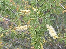 The flowers are produced in dense cylindrical spikes, each flower with five yellow petals 3 mm long and numerous yellow stamens 6 mm long.