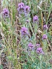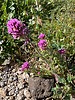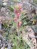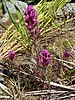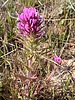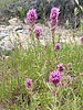 Orthocarpus purpurascens (Castilleja exserta) Common Names: Habitat: Hillsides, roadsides, flats, sandy plains. can from a dramatic blanket after a wet season. Flowers: pinkish flowering spikes 4" - 6" tall. We're hikers not botanists and pink is the predominant color you will see; but actually the flower is a tiny yellow flower surrounded by brushy, purple bracts (bracts are modified leaves which grow at the base of the flowers). Description: 6" - 8" tall. green, brushy leaves about 1" long. Comments: The plant is called Escobita in Spanish, which means "little broom". |