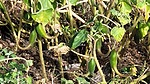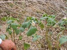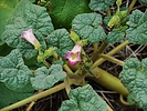 Proboscidea parviflora is a species of flowering plant in the family Martyniaceae known by the common names doubleclaw and red devil's-claw. It is native to the desert southwest of the United States and northern Mexico, where it grows in sandy, dry, and disturbed habitat and blooms during the hot summer. This is an annual herb growing from a taproot and producing sprawling, spreading stems. The leaves have rounded, oval, or roughly triangular blades up to 15 centimetres (6 in) long which have smooth edges or faint lobes or teeth. The inflorescence is an array of several showy bell-shaped flowers with five lobes flaring several centimeters wide. The flower is white to pink or purple, sometimes with mottling or lines of spots in the throat, and often a purple blotch on the upper lip. A yellow nectar guide extends along the lower lip. The fruit is a large seed pod many centimeters long, a cylindrical body tapering into a very long, thin, curving tail. As the fruit dries the tail cracks open and splits into two hooked, claw-like halves. The young fruits and seeds were used for food and the dark-colored hardened dry fruits were used in basketry by local Native Americans.
