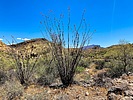 Fouquieria splendens Common Names Candlewood, Coachwhip, Jacob's staff, flamingsword. Personally, the only common name I have ever heard it called is the Ocotillo. An icon of the Sonoran desert. If the hike is in the Sonoran desert, it will have Ocotillos, even if we haven't associated them on the dynamic map. Habitat: Rocky slopes, mountainsides, desert areas, especially well-drained slopes. Flowers: Bright reddish-orange up to 1". In clusters up to 12" at the end of the canes. 5 petals fused at the base to form a tube. The bright crimson flowers appear especially after rainfall in spring, summer, and occasionally fall. Description Shrub (not a cactus). Up to 20' tall and a spread of 15'. Many unbranched, cane-like spiny, thorny stems that spread outward. Resembles an inverted cone. Stems are normally leafless. Bright green leaves appear on the stems after heavy rains. Leaves are up to 2" long and 1" wide. When arid conditions return, the leaves turn brown and drop off. Comments:Native. Spectacular. An icon. Shares dominance with Saguaro and Palo Verde. Used for fencing and stems used to support thatched roofs. An important source of nectar for hummingbirds. Related to the boojum tree. "The common name is derived from the Aztec word for pine (ocotle) and the Spanish diminutive (-illo). Thus, "little pine"". Ronald J. Taylor. Desert Wildflowers of North America |