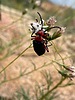 Lytta magister Typically 16 to 33 mm (0.6 to 1.3 in) in length, L. magister has a striking red head, legs and prothorax, with black elytra. They can be found in great numbers in the Mojave and Colorado Deserts in spring, and are often seen in swarms. Females lay eggs in holes in the desert soil. The larvae are insectivorous, mainly attacking bee nests. They consume the immature host along with its provisions, and can often survive on the provisions alone, thus they are not obligatory parasitoids but rather food parasites that are facultatively parasitoid, or simply predatory. Adults feed on flowers and leaves of brittlebush. Source Wikipedia |