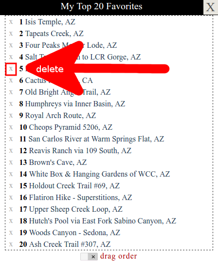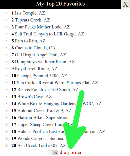 | What Hikers enjoy sharing their favorites. This is a collection of your favorite 20 hikes on HAZ. Where Look for the red heart • Set on guide pages and TrailDEX ( Find > Filter ) • View on profile pages Sort Change list order. [ example ] Delete Look for the x before each entry. [ example ] | |