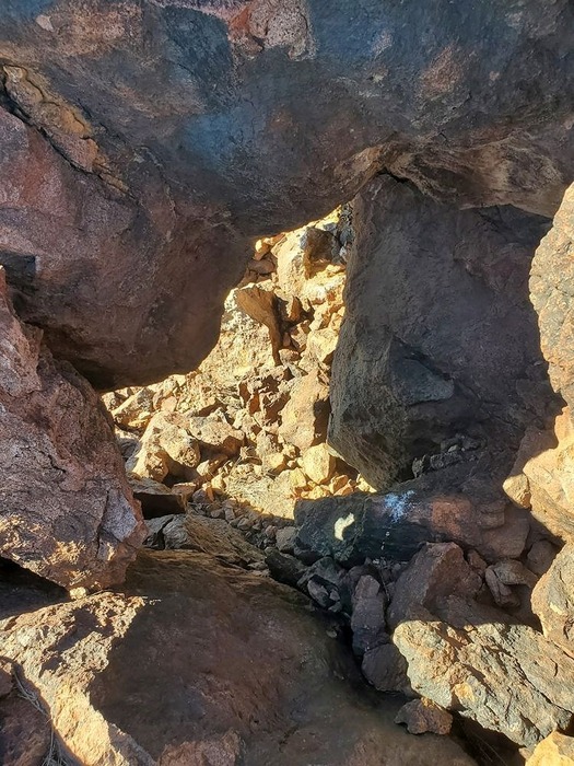 Looking up through a doorway going under some huge boulders. This area provides a lot of shelter and would be a great place for a break.