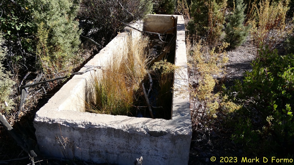 "John Hughes" concrete water tank at Squaw Flat Spring along Sheep Creek Trail #88. 54.64 °F