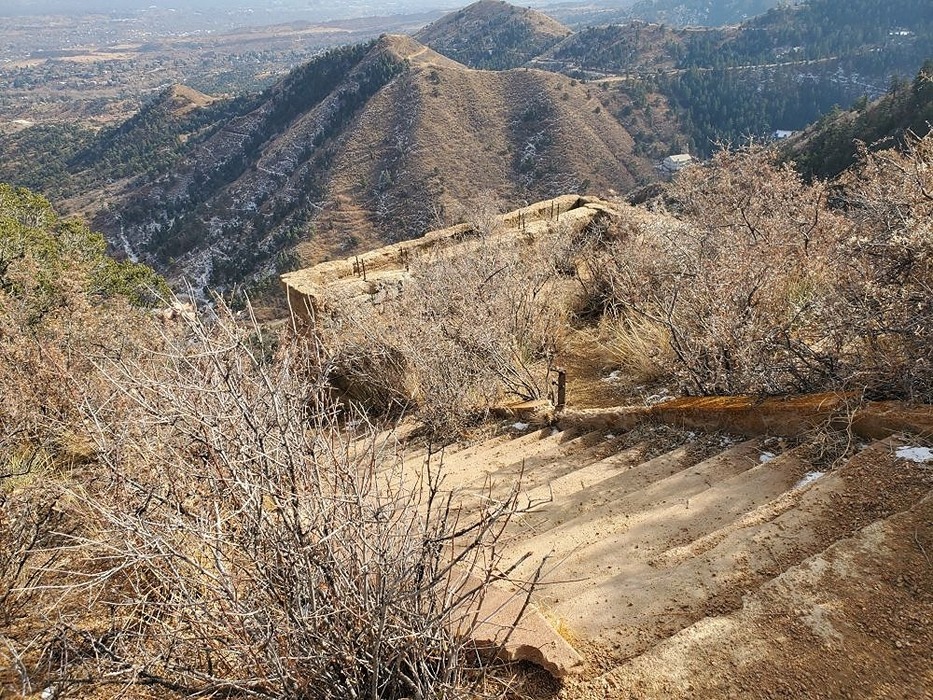 at the summit, looking at an old concrete structure. Iron mountain is the next mountain over.