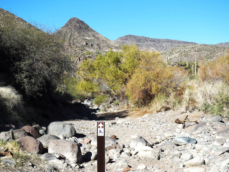 Newly placed carsonite marker smack dab in the middle of the creek! 8 months out of the year there is a foot of water flowing through here. The arrow should be pointing to the right. The other side is correct. This will no doubt cause much confusion for the below 85 I.Q. Instagrammers.