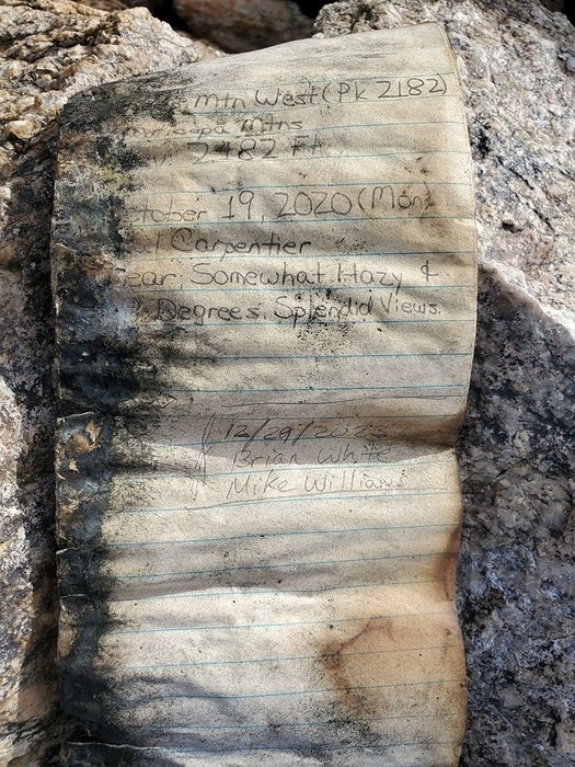 On the summit, we found a registry from Oct 19, 2020 that was in bad condition probably because it was in a plastic jar that was cracked. On the few occasions where this area gets rain, it probably allowed debris to get inside the jar. This is where we learned the true name of this numbered peak, thanks to Paul Carpentier for specifying the name and leaving the registry.