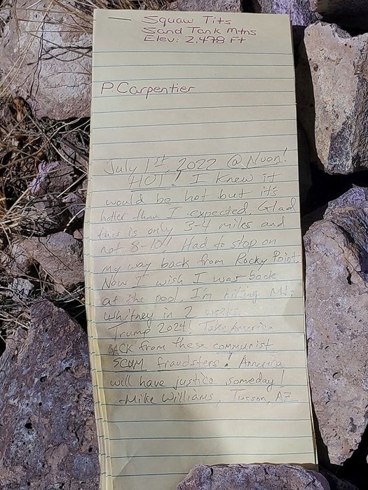 my registry entry, and I meant every GD word I wrote! Thanks to Paul C for leaving the registry. It was hard to tell but I believe what he wrote was faded by water damage. But, I don't quite understand why his name wasn't wiped out. This hike was 2 weeks before I hiked Mt Whitney (elev 14505) in California.