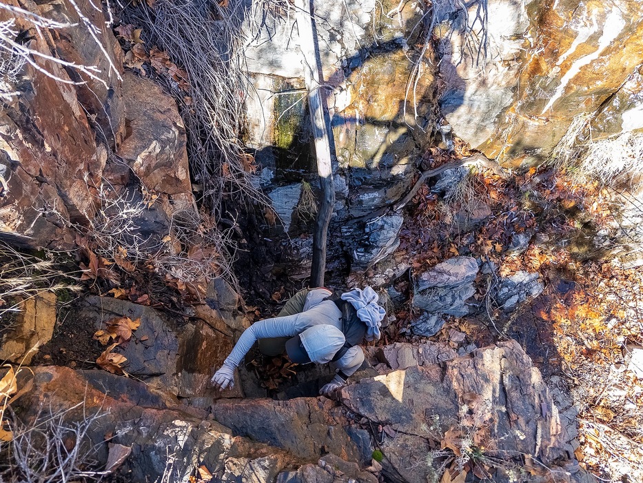 climbing up and partway out