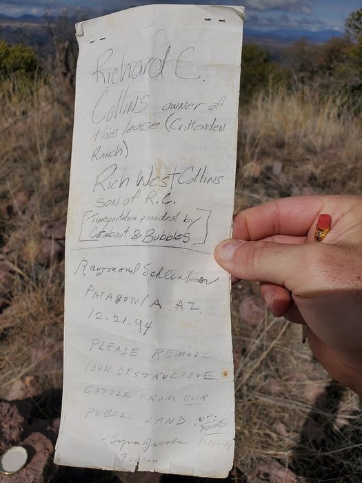 Registry entries from 1994... Some ignorant person named Lynn J. talked about "destructive" cattle "ruining" our public land. First of all she doesn't understand that the cattle owners are paying for the rights to use the "public land" which include allowing their cattle to graze there. Second, the cattle are eating a lot of the grass and plants that they are more adapted to eat, instead of being forced to eat corn and grains on some factory farm, being cooped in with thousands of other cows and subject to terrible diseases and given drugs and anti-biotics just so they can stay alive until they are ready for slaughter. Third, by allowed the cattle to graze, it clears up the land and makes the hike a more pleasant experience for us hikers. Fourth, does this woman think that the wild animals, who were here before us, are also "destroying" the land? Animals such as javelina, coyote, deer, packrats, snakes, etc.? If the cattle were wild and not "owned", this is the place they would be living.