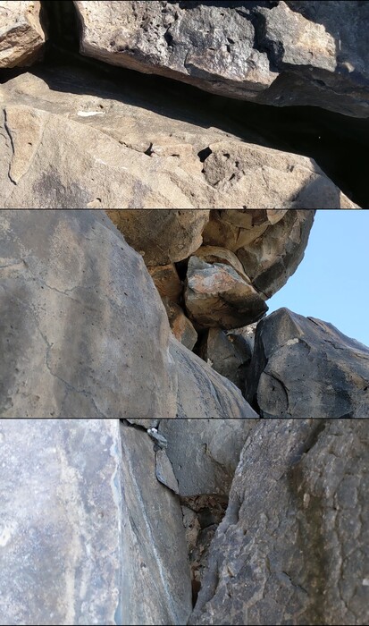A few days later, my plan was ruined when I dropped my phone/camera at the cliff top, down into that crack (top). After a couple hours I figured it must've exited through that little triangular hole (center)...looking up here. And just before I gave up, was amazed to find it laying in the hole (bottom) well below my feet. It fell about 25-30' - no damage!