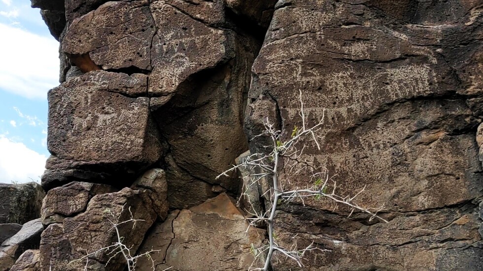 Now to a 3rd site. Lots of bighorns/deers and "triangle streamers" on this rock outcrop though surface is rough and not easy to write on. Immediately to my right (out of scene) is the entrance to a cave (next picture) I'd missed on my only previous visit here because bees made us keep our distance.