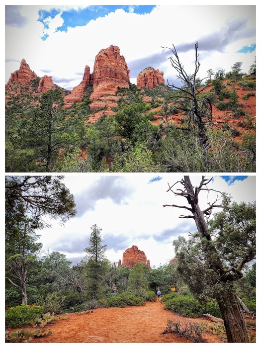 Heading up Cibola Pass. Top photo shows Glory Morning Spire and Mitten. Below shows Kelly by the Wilderness sign with the Mitten in view.