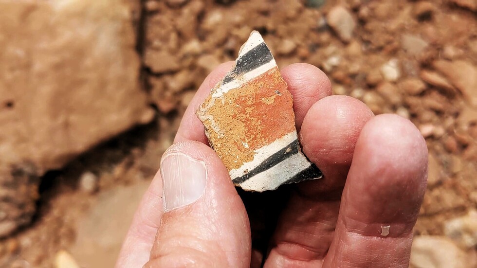 Amongst the Jeditto yellow I was surprised to find this one. The black and white paint on brown looks like some pottery found locally in central AZ (Salado I believe). If so, it must've moved up to Winslow through trade.