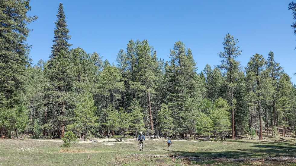 Crossing one of the few open meadows in the bottom of Maverick Canyon.