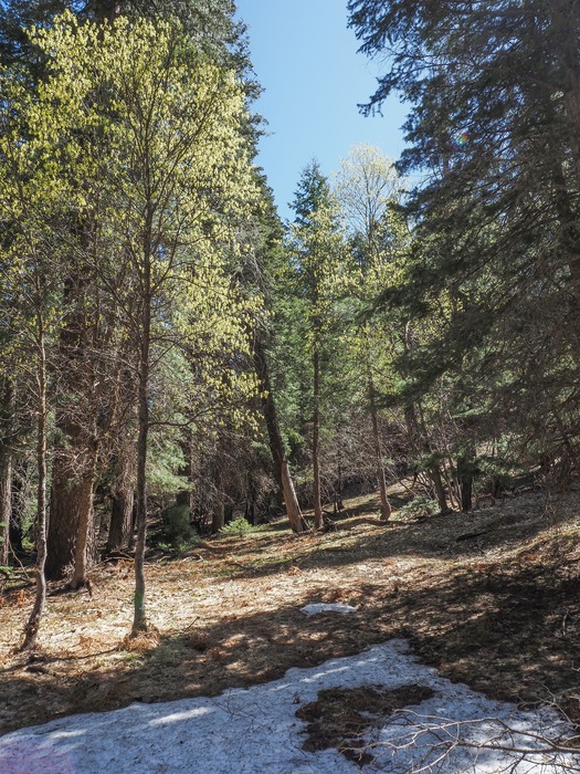 Only a few deciduous trees had started to leaf out for spring. The large leaves of the Bigtooth Maples from alst Fall carpeted the canyon floor but those trees were still bare waiting for spring.