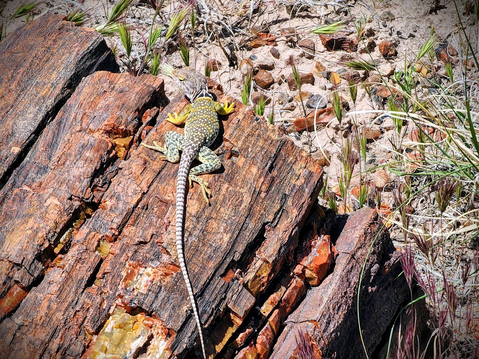 The collared lizard (Crotaphytus collaris) is distinguished by the two black collars around its neck. Adult males have bright green scales as well as tan, olive, brown, bluish and yellow scales. Females are less colorful than the males. Both have whitish bellies and large heads.