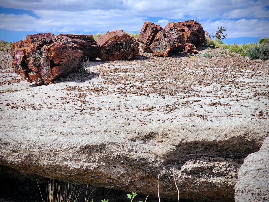 About 218 million years ago, flood waters carried fallen trees to this spot. After being quickly covered with sediment they slowly petrified their organic matter replaced by silica minerals over millions of years. Some of these prehistoric trees stood 200 feet tall. This pile-up of logs is an ancient log jam, brought to the surface again through erosion.