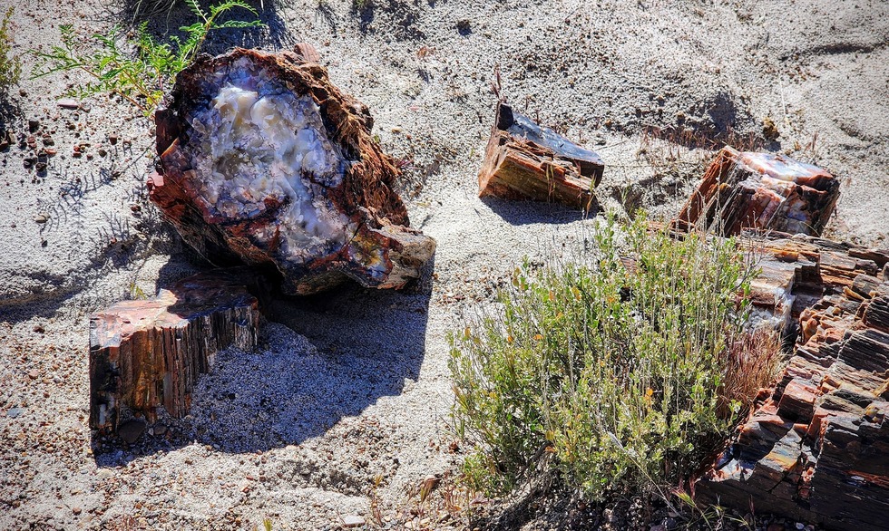 The name Crystal Forest come from the fact that the trees of Crystal Forest were once covered in sparkling quartz and purple amethyst crystals that developed in the hollows of the logs as the trees petrified. Unfortunately, in the late 1800s, before the establishment of Petrified Forest National Monument, many ancient logs were dynamited by those seeking the semi-precious gems. Massive petrified trees were blasted into the small chips you can still see scattered about alongside the trail.