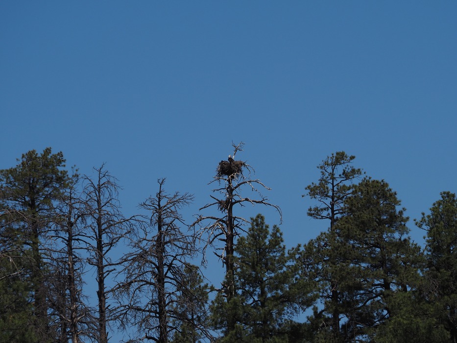 Telephoto view of the Bald Eagle nest from a viewpoint on the west lake bank that was being used by a young man employed as a watcher by the AZ Bald Eagle Nestwatch Program. One of the parents, probably the female, can be seen standing in the center of the nest with 2 of the 3 eaglets barely visible on the left side of the next.