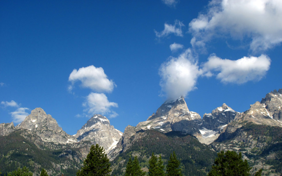 Driving to the TH on the Teton NP entrance road(via the park's Moose Junction entrance), views of a number of the major technical climbing peaks(left to right): South Teton@12514',Middle Teton@12804',Disappointment Peak@11618',Grand Teton@13770',Teton Glacier, & Mount Owen@12928'; In pic lower right, this days hike is going up into a part of this drainage & up the left-lower front of Disappointment Peak where Amphitheater Lake resides at 9760';