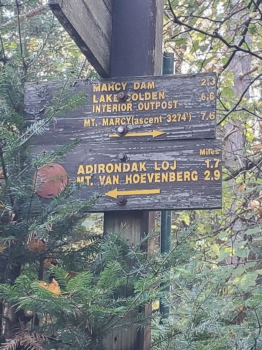 Sign from near where I parked saying that Mt Marcy would be a round trip of 15.2 miles. For me, it ended up being 17 miles maybe because of the extra distance to look at Indian Falls, walking around the peak, and any imperfections related to my GPS device.