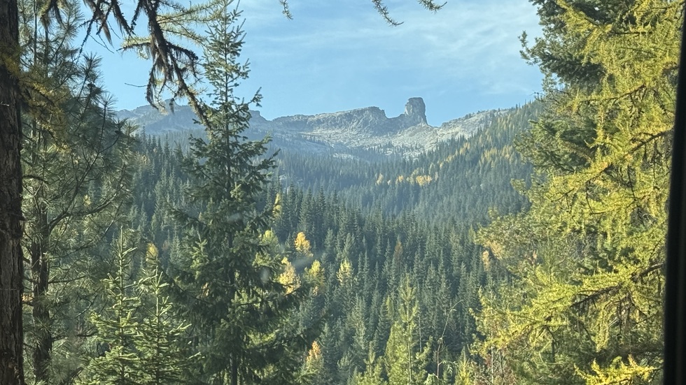 On the drive in, you only get about two glimpses of Chimney Rock from the road. I snapped this out the truck window. I'm guessing that ridge to the south of Chimney Rock used to connect all the way, and the rock broke out over time, creating that saddle between the ridge and the rock.