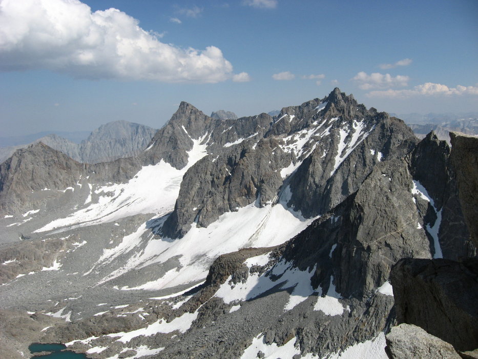 Looking south from the summit at the north end of the Palisades, with the Palisades glaciers at the base of the sub-range of the same name. The highest peak is North Palisade (14,242') and it is the 4th highest peak in California, however, Startlight Peak (14,200') may block it's view and if so, it is the highest peak in the center of the group. If not, North Palisade is.