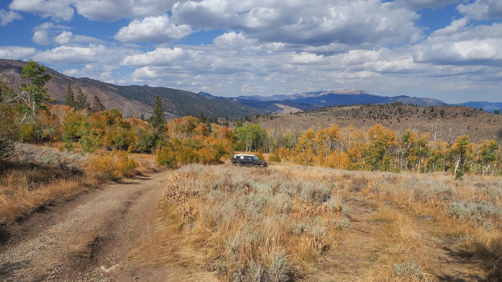 The road left the bottom of the valley and became a rough 4x4 road as it climbed the south side. I decided to park my car at this point and walk a mile further in my exploration. No sense risking a breakdown on the rough road in the vehicle that had to take me 700 miles back to Phoenix. It was on this hike that I met 2 fishermen hiking down the road who were carrying two empty buckets. They said there was a trail leading off this road to a couple small lakes higher up in the mountains. Always a smartass, I asked if they took the buckets to carry back all the fish they had planned on catching. No, they took the buckets to sit on while they fished. Shortly after, I encountered two rifle toting deer hunters who hadn't had any better luck hunting deer than the fishermen had catching fish. Oddly, all 4 knew about the elk in the sheep flock.