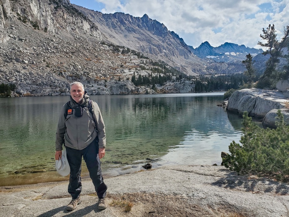 It was threating to rain causing me to take quick action which usually immediately stops the rain - I put on my full rain gear, and it worked. Photo courtesy of a backpacker hanging out at his camp while his wife explored the trails beyond Blue Lake on a day hike. I explained to him my plan to continue on to Baboon Lakes. He asked what time I started the hike and when I told him, he said "At that rate you'll never make it to Baboon Lake and back before dark. If you don't have a head lamp you should turn back now." Good advice which I followed.