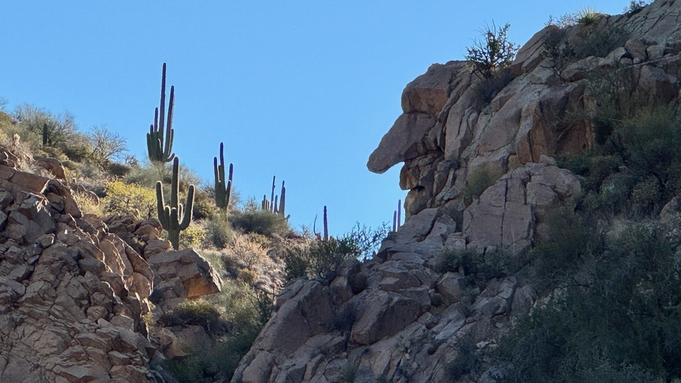 One of the most distinct rock faces this side of South Dakota watches over the dryfall we had to bypass.