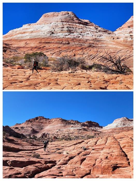 Hiking on the sliced bedrock as we continue toward the Wave.