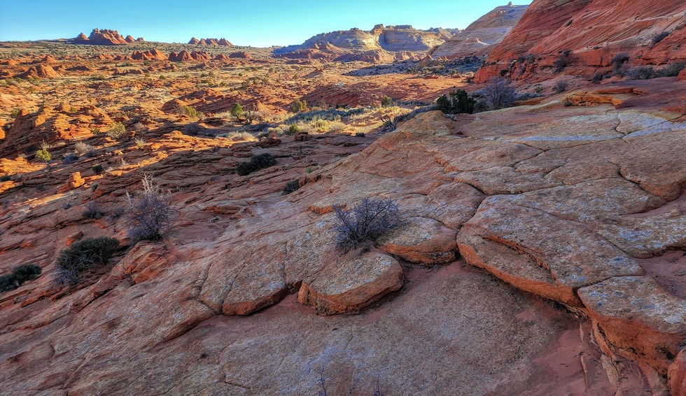 Looking mostly south at the North and South Coyote Teepees (Buttes) and THE Wave formation south.