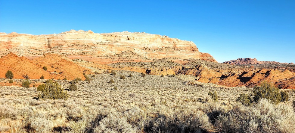 A meadow of sagebrush fills this area; it's quite something. Those cliffs over there are part of West Clark Bench, the area above the cliffs you see to the east - northeast when hiking to The Wave. Edmaier's Secret lies below the cliffs, as does Buckskin Gulch. West Clark Bench is largely devoid of vegetation and is heavily crossbedded, and like the White Pocket it is full of cauliflower / brain rock and water pockets. It also has a great deal of fin / lace rock and because the area is remote and sees little visitation the fins are well preserved.