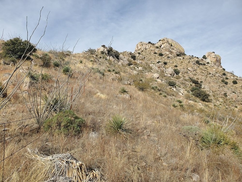 we took our first break at 2 miles in and at this point had about 1,700 feet of elevation. There was a barbed wire fence to the West. Brian went a little further South and saw evidence of mining in that area.
