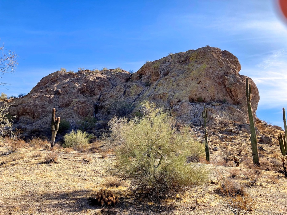 West Face: Looks like there might be a non-climbing approach, left-to-right across the top of that saguaro.