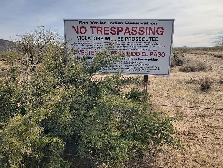 At Northern border of San Xavier reservation which is also very close to the Pascua Yaqui reservation high point. This should be a reminder of the contrast between the 2 reservations. The Pascua Yaquis allow anyone to walk freely. The San Xaviers apparently don't even allow hikers which is strange. The sign is stupid because it talks about staying on paved roads. There are no paved roads anywhere around here!!