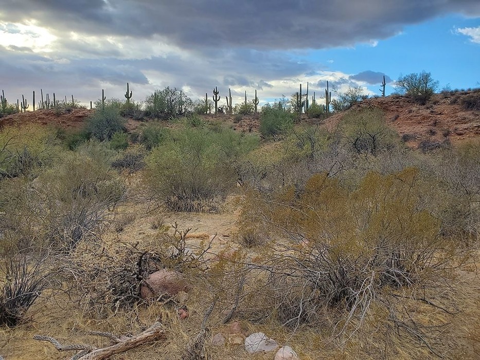 crossing the final wash, heading toward the channel I came down and the unique cactus above it.
