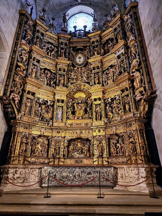 The 1500s altarpiece has nine streets, of which three on each side are basically pillars with figures of saints, biblical characters, Nereids, Tritons, which tell us about the influence of Castilian sculpture, two side streets to the right and left have passages from the life of Christ and a beautiful central street and is four stories high above the alabaster predella.