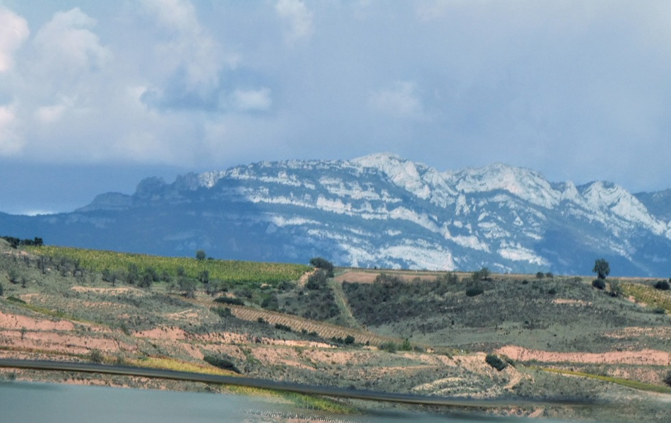 From the bus: I am looking west at Eskamelo 4268 elevation in the Sierra de Cantabria or Toloño, specifically, in the south of the province of Álava, although this mountain range shares other peaks with La Rioja. It is a very alpine mountain range, with almost all the peaks culminating in pointed shapes, with aerial ridges and to access most of its peaks, you have to overcome some easy climbing. In addition, it is a mountain range with a marked contrast in vegetation, the northern slope is populated by a dense beech forest, while on the southern slope, a more Mediterranean vegetation predominates, mostly composed of oaks and plants from drier climates.