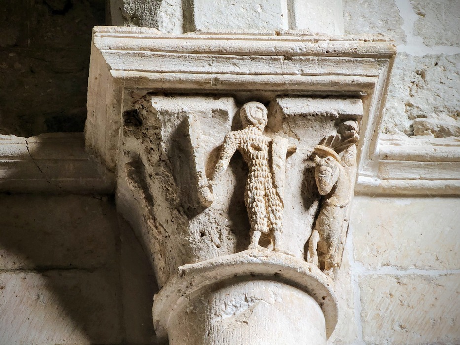 “This capital probably belongs to the first phase of construction in the 12th century. It is quite deteriorated and one of its sides has been completely worn away. On the remaining sides can be seen two figures, one standing, the other on a horse. The first wears chainmail, helmet and carries a sword and shield as if attacking. The knight on the horse also has on a helmet and carries a shield. The horse’s front hoof is lifted as if charging. It has often been interpreted as the struggle between Roland, one of Charlemagne’s knights, and Ferragut the giant moor. Roland defeated him because he knew his enemy’s one weak point. This scene is frequently represented all along the pilgrim route as it is said to have taken place in the nearby town of Nájera.”