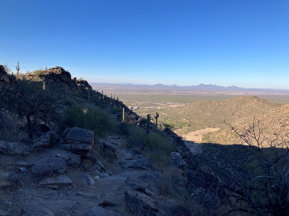 Hiking down the inner canyon wall on a very engaging trail. Looking out at what I believe is part of the Marana Valley.