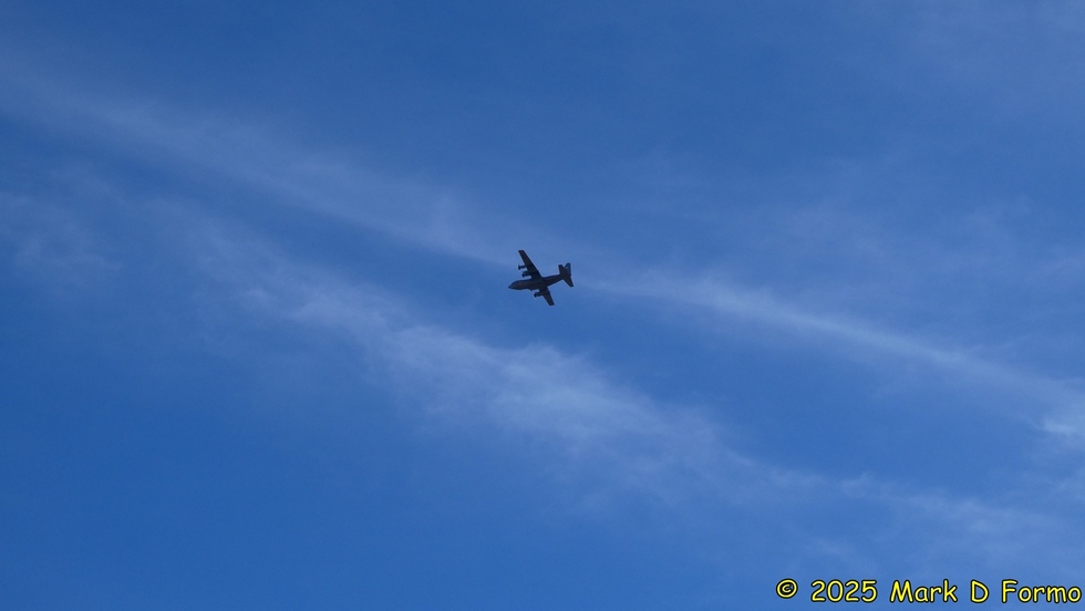 An Air Force C-130 Hercules which was flying long racetrack patterns from Fort Huachuca up to Hewitt Station Road, where it circled a number of times before turning South, going West of Picketpost on the return leg. It flew over us at least three times on its Northbound legs. 47.32 °F