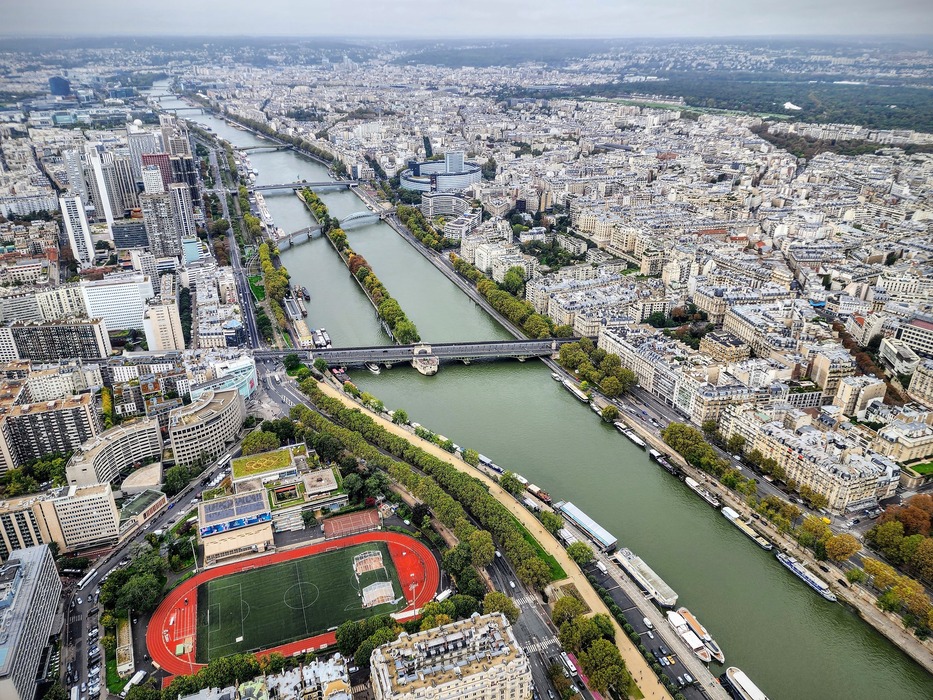 Looking SW: L'île aux Cygnes (Swan Island) Park, on the Seine, with the Statue of Liberty at the far tip. An artificial unihabited island on the river Seine in Paris, France, in the 15th arrondissement. It was created in 1827 to protect the bridge named the Pont de Grenelle.