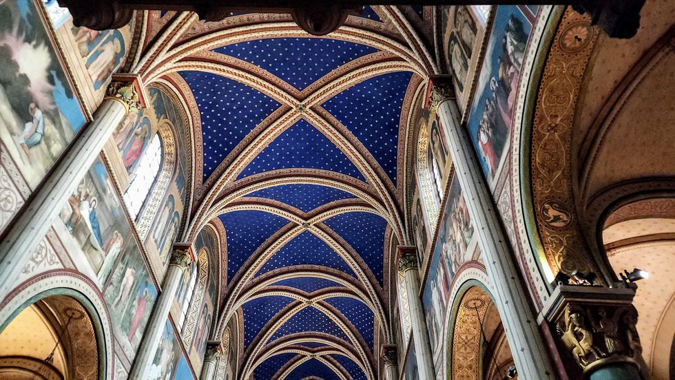 Thanks to a recent deep cleaning to remove layers and layers of grime, the church's interior almost vibrates with color. Look around, and you'll see spectacular 19th-century murals, elaborately decorated columns, and overhead, a deep-blue vaulted ceiling covered with 3,000 golden stars.
