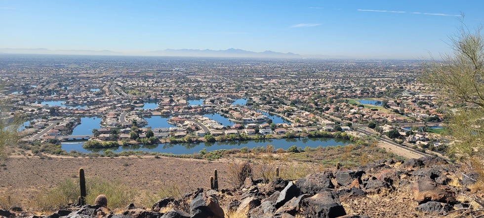 Looking south past Arrowhead Lakes, the brown cloud and South Mountain