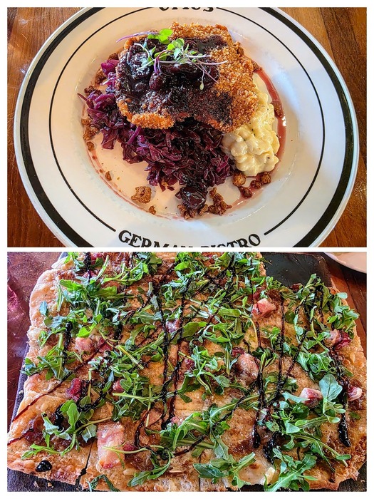 I really enjoyed tonite's Duck Schnitzel (maple leaf farms duck breast, käsespätzle, rotkohl, kirsch demi-glacé, duck cracklings). The Flammkuchen was to die for! (house made flatbread | crème fraîche | candied bacon | caramelized onions | cambozola | gruyère | aged balsamic | arugula) vs last nite's Jaeger Schnitzel.