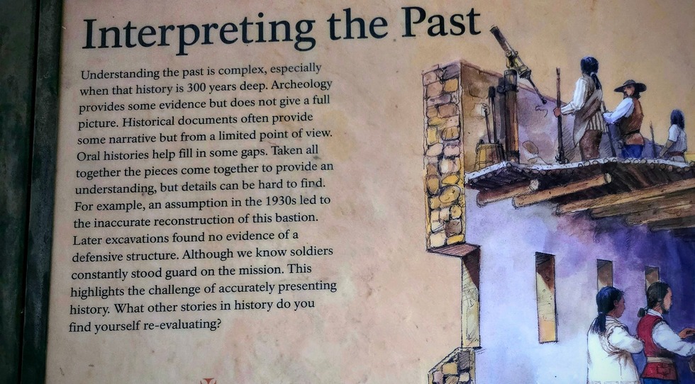 Understanding the past is complex, especially when that history is 300 years deep. Archeology provides some evidence but does not give a full picture. Historical documents often provide some narrative but from a limited point of view. Oral histories help fill in some gaps. Taken all together the pieces come together to provide an understanding, but details can be hard to find. For example, an assumption in the 1930s led to the inaccurate reconstruction of this bastion. Later excavations found no evidence of a defensive structure. Although we know soldiers constantly stood guard on the mission. This highlights the challenge of accurately presenting history.