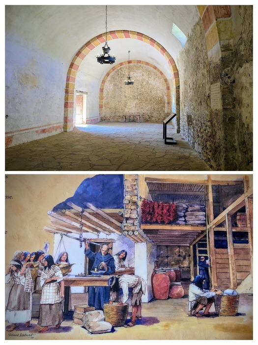 On the northwest corner of Mission San José, next to a large gate, is the granary. It was first mentioned in 1755 and had the capacity to store enough maize to supply the mission for an entire year.
