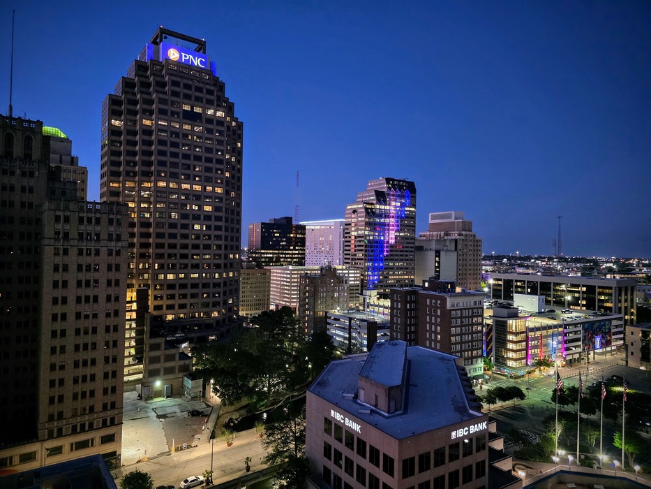 We were on the top floor of Embassy Suites so could even see down to the river below. The building with the blue and pink changed colors from time to time.